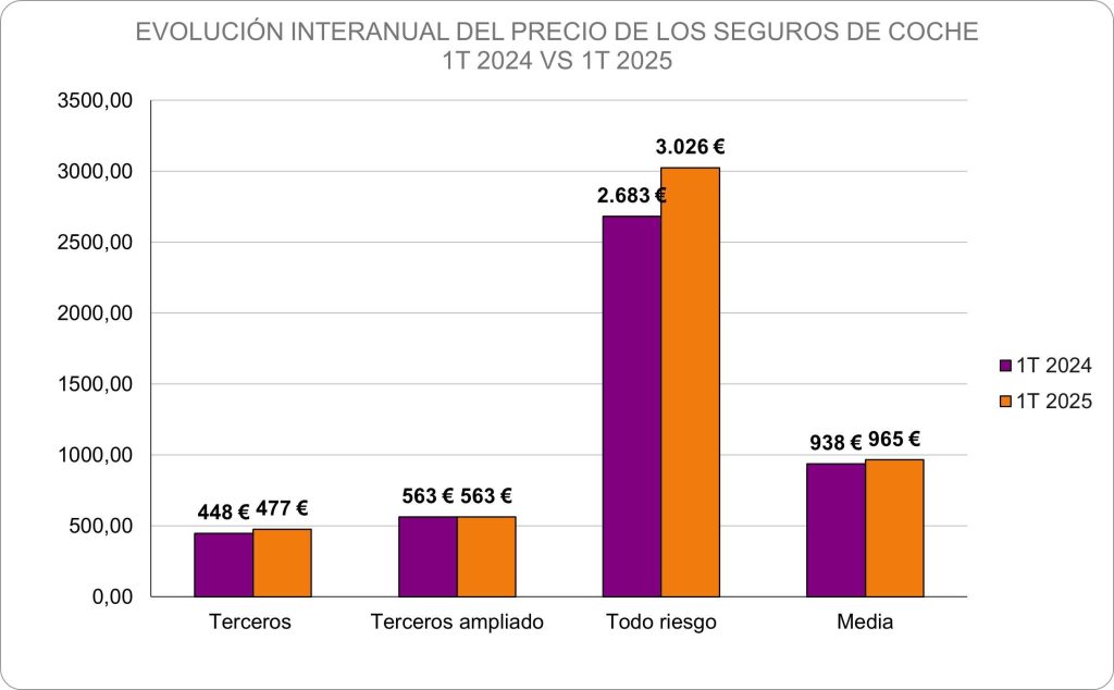 Los seguros de Autos subieron de precio un 14% en el primer trimestre de 2025 en comparación al último trimestre de 2024, alcanzando un coste promedio de 965,16 euros y subiendo alrededor de 120 euros al año la cuota de los conductores españoles, según el comparador Kelisto. La modalidad Todo Riesgo vuelve a liderar la subida, con un 19,63% de encarecimiento intertrimestral. Sin embargo, los seguros a Terceros también subieron un 12,58%.